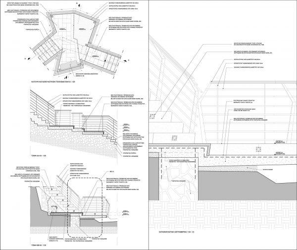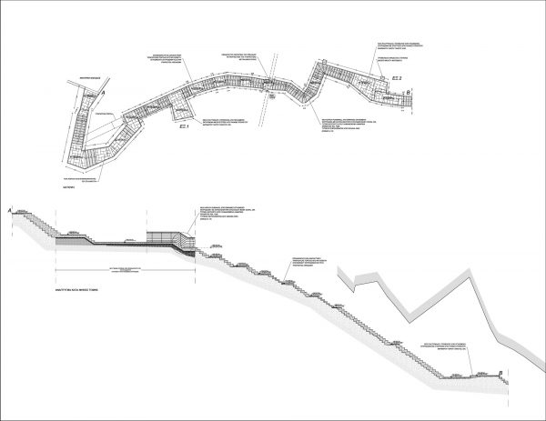 Η επέμβαση γίνεται στην ήδη υπάρχουσα πορεία με οπλισμένο σκυρόδεμα και επενδύεται στα πλατύσκαλα με χτενιστό Μάρμαρο Πάρου και στα σκαλοπάτια με ειδική αντιολισθηρή επίστρωση, επίσης σχεδιάσθηκαν ειδικές κατασκευές από ανοξείδωτο χάλυβα στις οποίες τοποθετήθηκαν οι Η/Μ υποδομές