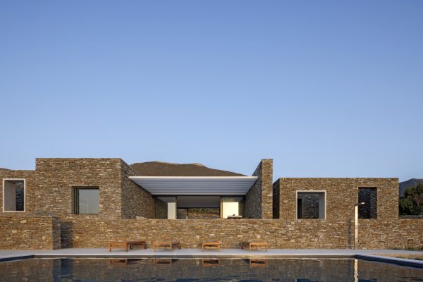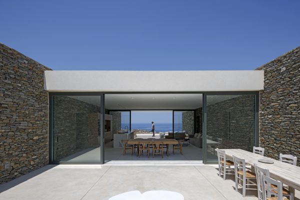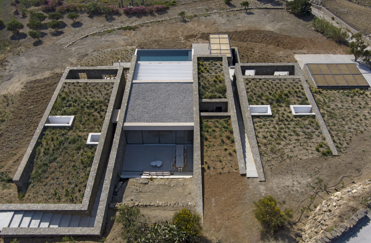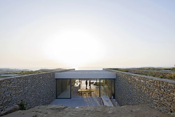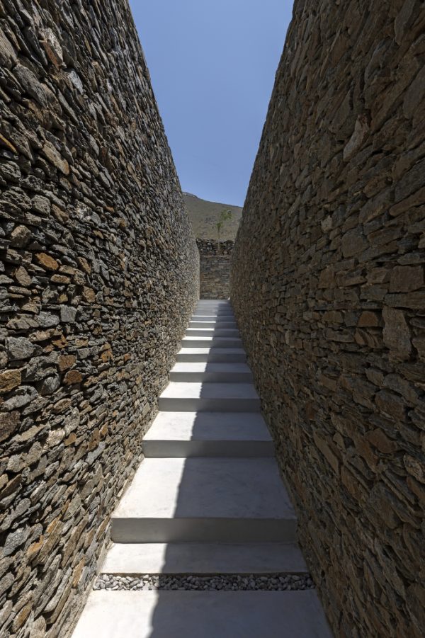 Η αρχιτεκτονική, υιοθετώντας μία πιο ταπεινή, ευλαβική προσέγγιση, δεν οριοθετεί τον χώρο ξεκάθαρα αλλά επεκτείνει τα όριά του, χωρίς να επισκιάζει το άνυδρο, βραχώδες περιβάλλον. Ο άνθρωπος και η σχέση του με την πέτρα και τη φύση είναι ο λόγος ύπαρξης της αρχιτεκτονικής παρέμβασης. Το αποτύπωμα περιορίζεται στο ελάχιστο, δοξάζοντας την ιδιαιτερότητα του τόπου των Κυκλάδων.