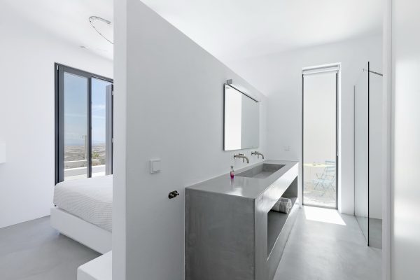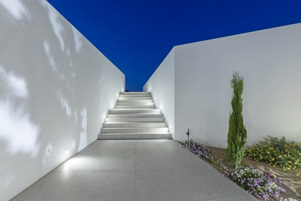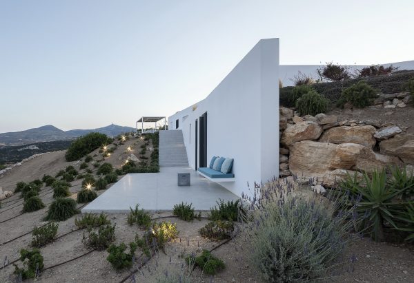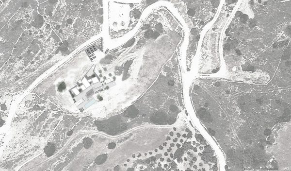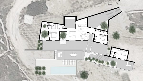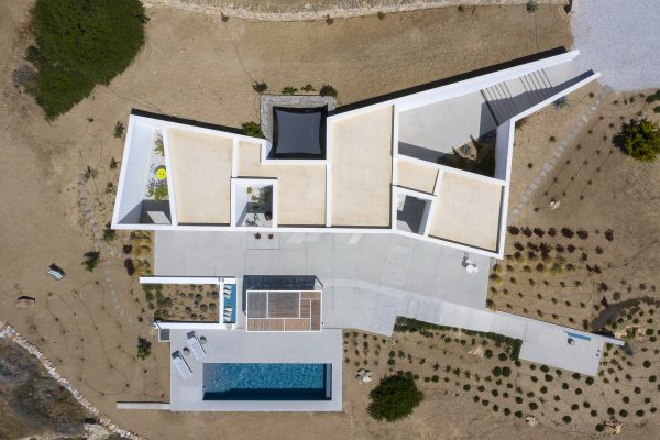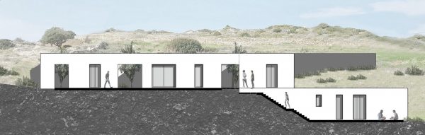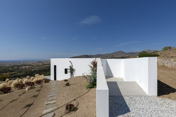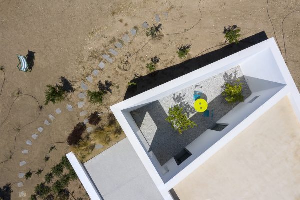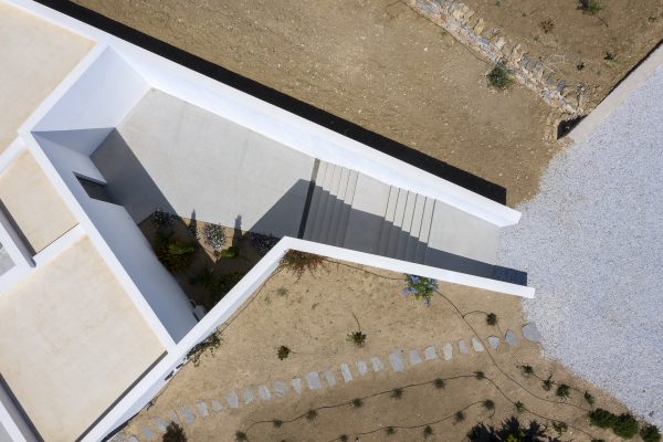 Οι με μωσαϊκά, στρωμένες αυλές διαμορφώνονται δίπλα στους χώρους διημέρευσης και ακολουθούν τη φυσική κλίση του εδάφους. Η περίκλειστη αυλή στη δυτική πλευρά συνδέεται άμεσα με το καθιστικό. Το καθιστικό, η κουζίνα και τα δύο υπνοδωμάτια έχουν θέα προς την θάλασσα. Σε χαμηλότερο επίπεδο τοποθετείται υπόσκαφος ξενώνας.