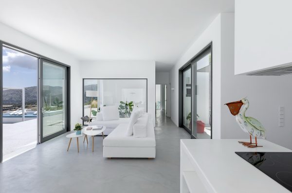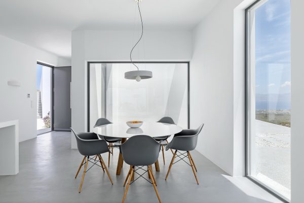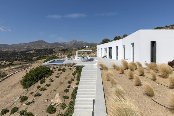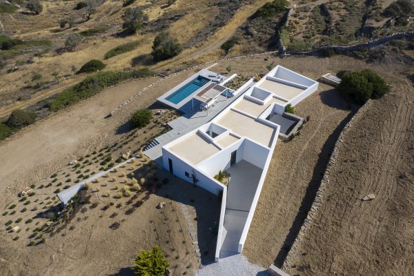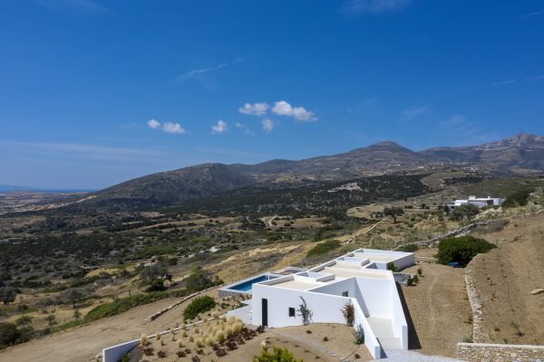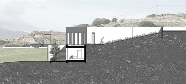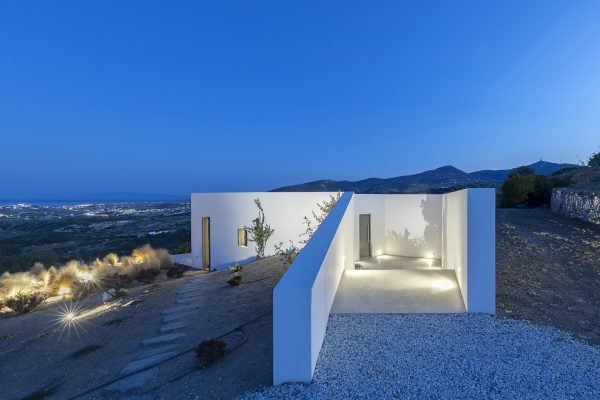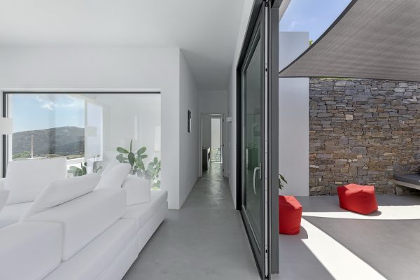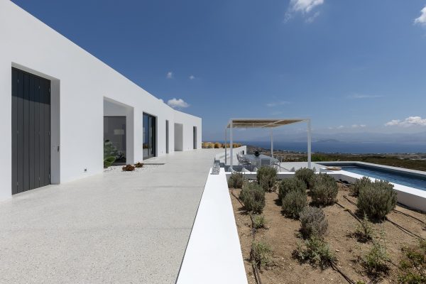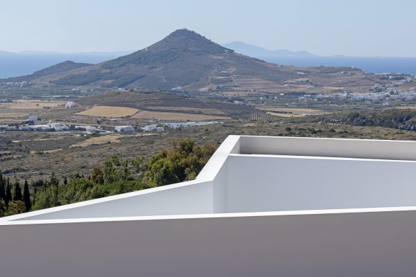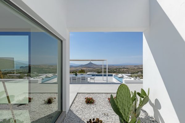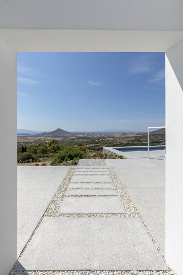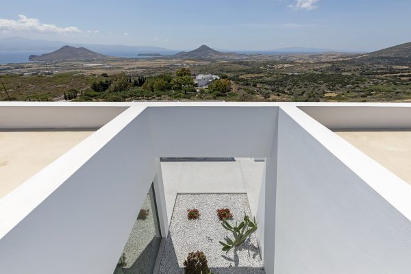 Στην δυτική πλευρά και στο ψηλότερο σημείο του οικοπέδου διαμορφώνεται μια είσοδος / κατάβαση , η οποία οδηγεί στην καρδιά της κατοικίας. Ένας διαμήκης διάδρομος συνδέει τα δωμάτια της κεντρικής κατοικίας προσφέροντας καρέ καρέ θεάσεις προς το ακρωτήρι του Κέφαλου στην Πάρο και τη γειτονική Νάξο μέσα από τα επιλεγμένα ανοίγματα της νοτιοανατολικής όψης της κατοικίας. Η κατάβαση προς το εσωτερικό και στη συνέχεια προς το μεγάλο εξωτερικό πλάτωμα των χώρων διημέρευσης είναι μια σταδιακή μετάβαση προς τα καδραρισμένα τοπόσημα του Αιγαίου μέσα από την κατοικία και την πανοραμική θέα από το πλάτωμα: η Νάουσα, η χώρα της Νάξου, το ακρωτήρι Αντικεφάλου, η δυτική πλευρά της Νάξου, το Καστράκι, η Ηρακλειά και η Ίος απλώνονται μπροστά στα μάτια του κατοίκου/θεατή.