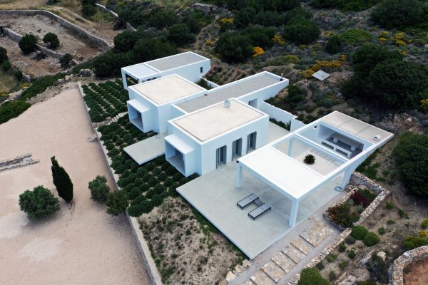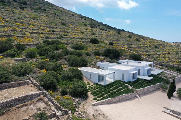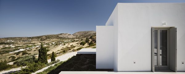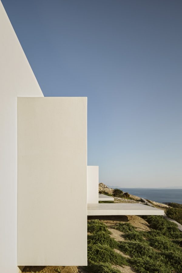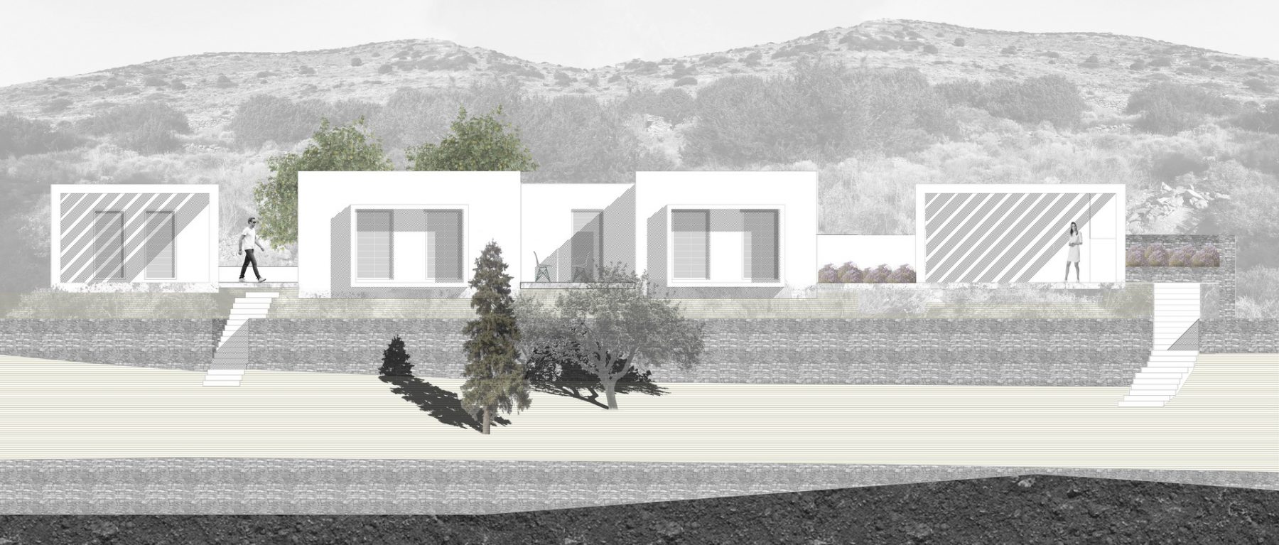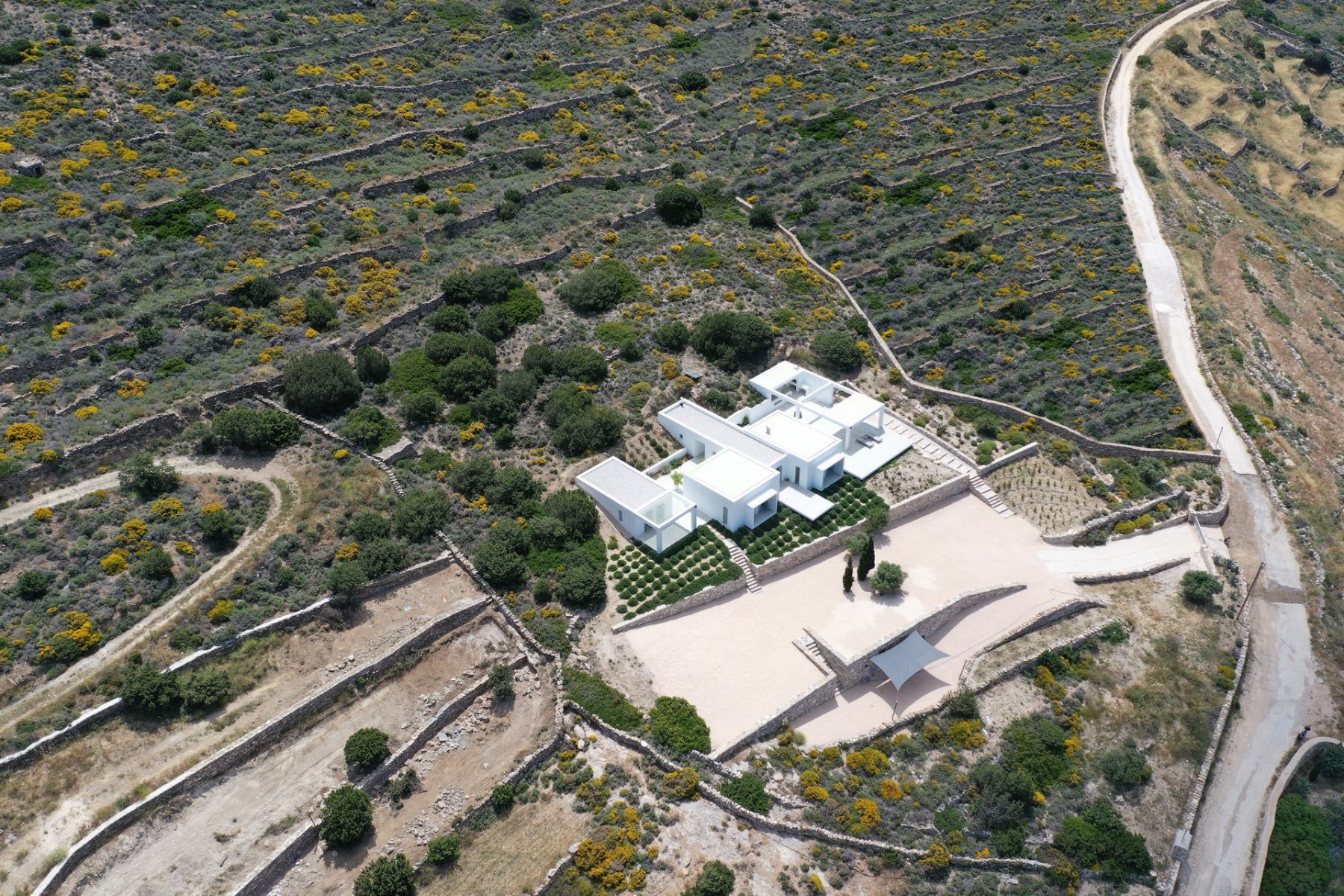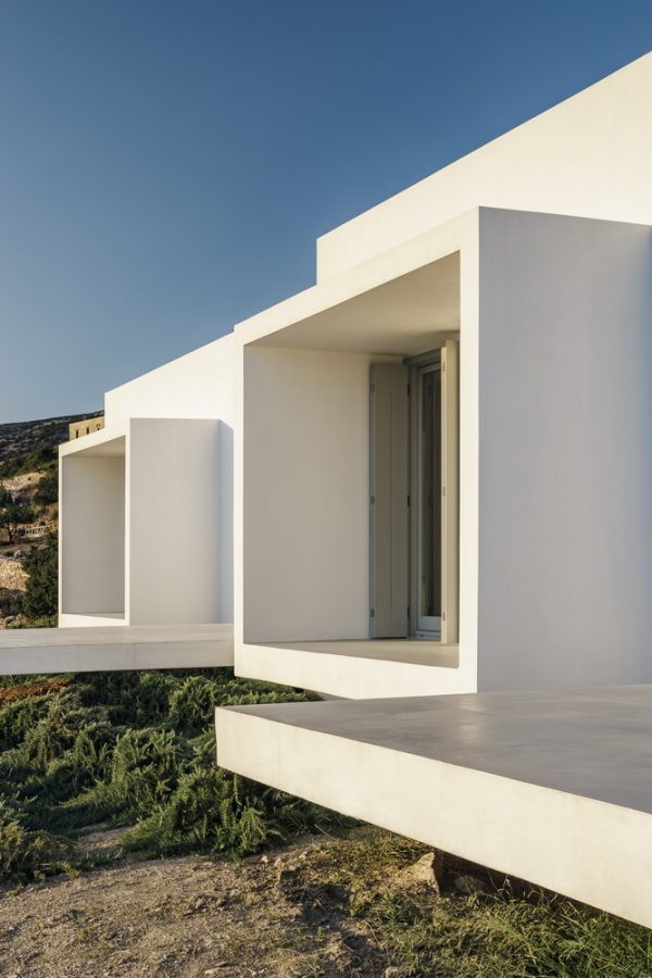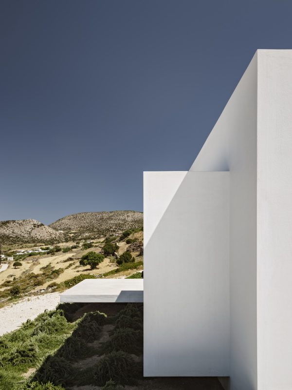 Χρησιμοποιώντας τα στοιχεία της κυκλαδικής αρχιτεκτονικής ανάλογων κτισμάτων , σχεδιάσαμε ένα σύνολο λευκών όγκων και εξωτερικών διαμορφώσεων , σε παράταξη, που εποπτεύει τη πλαγιά του λόφου μέχρι τη θάλασσα και τη γειτονική Αντίπαρο.Η κατοικία εναρμονίζεται με το τοπίο καθώς δεν δημιουργούνται καθόλου μπροστινές αυλές. Οι όγκοι τοποθετούνται κατά μήκος μιας υπάρχουσας πεζούλας- αναβαθμού χρησιμοποιώντας αποκλειστικά το φυσικό πλάτωμα.