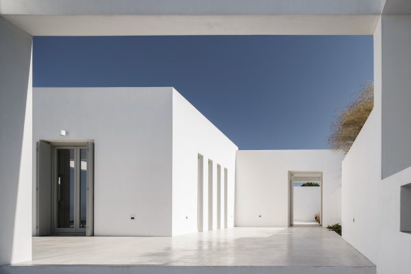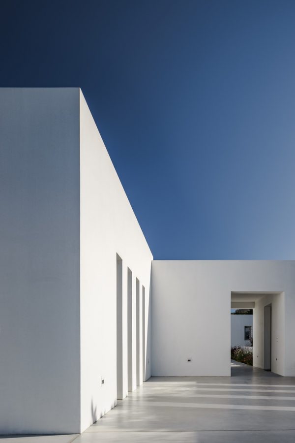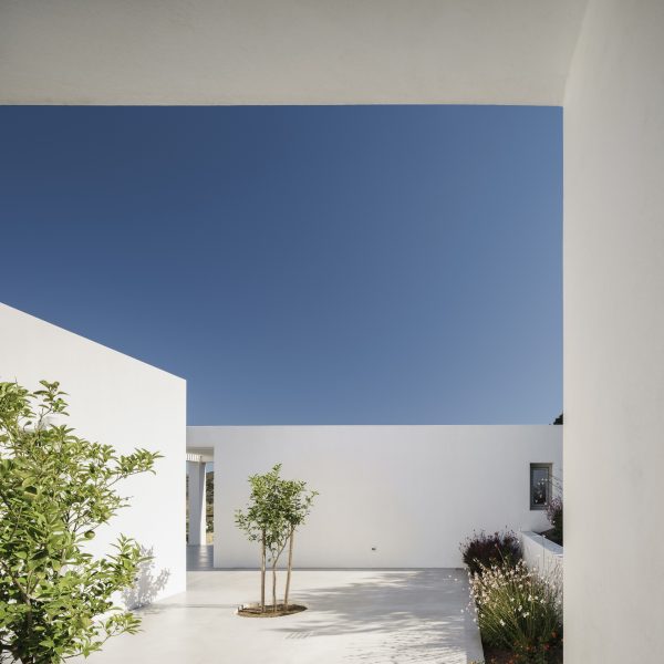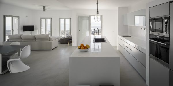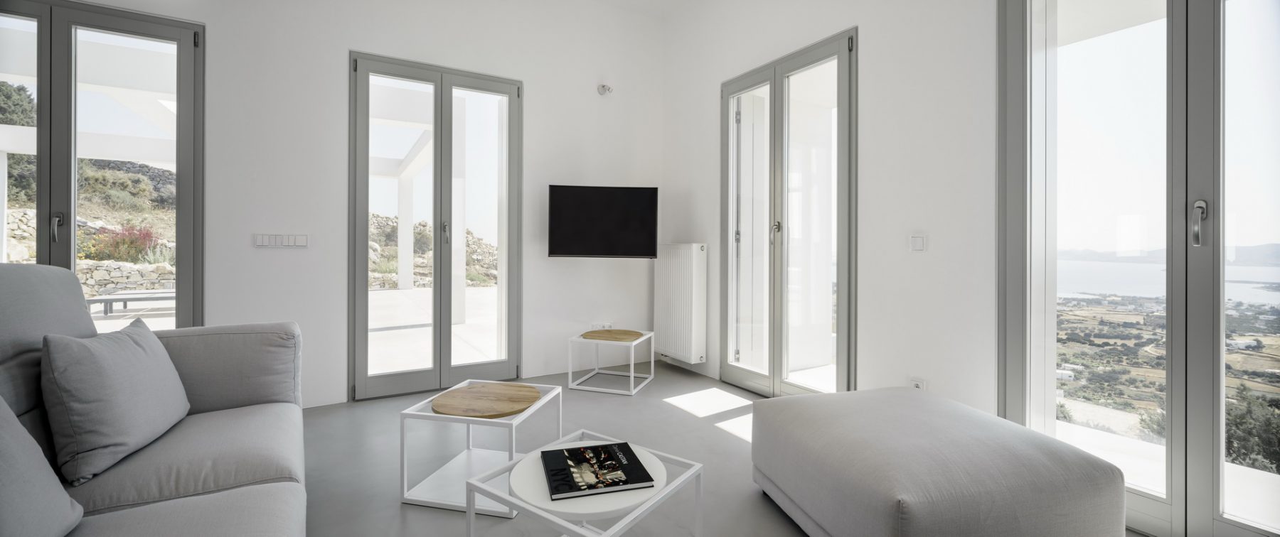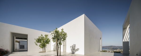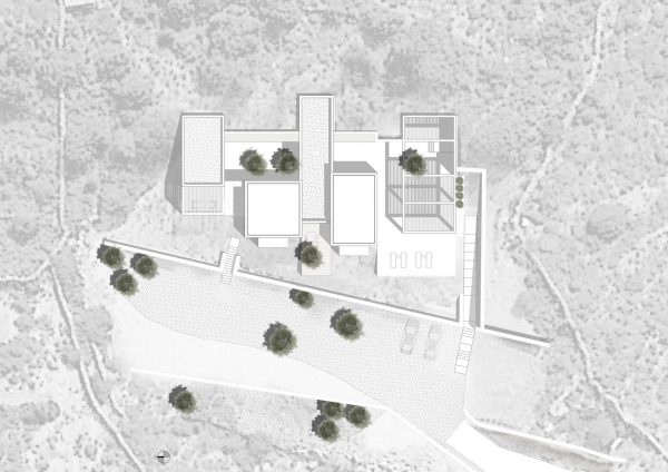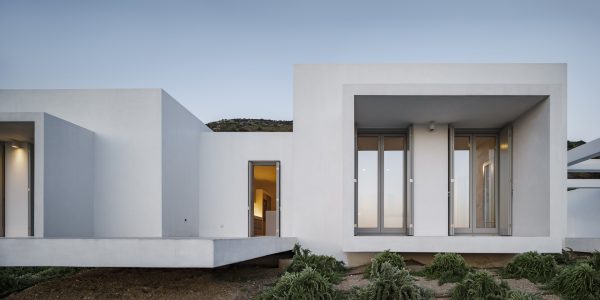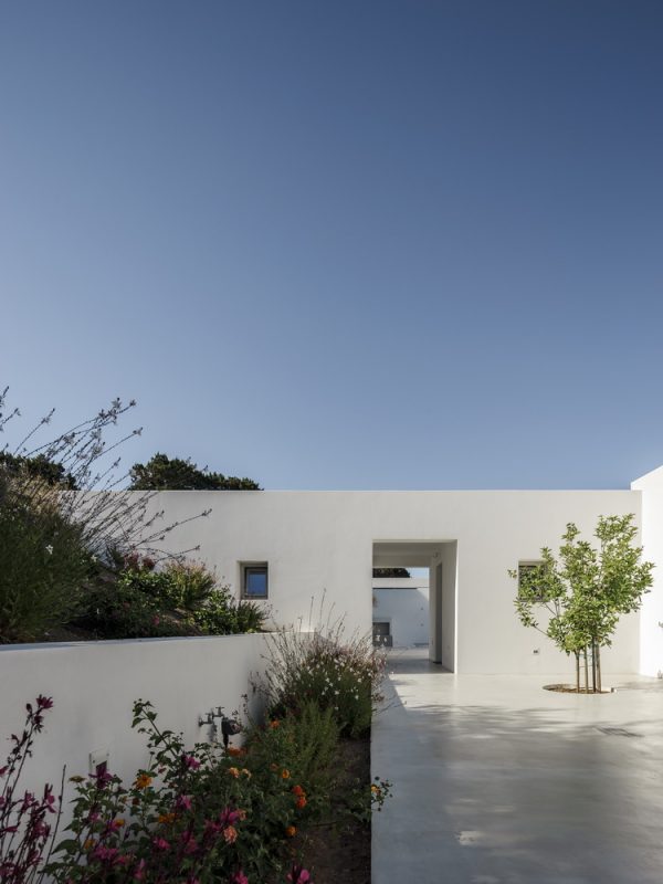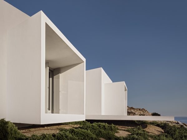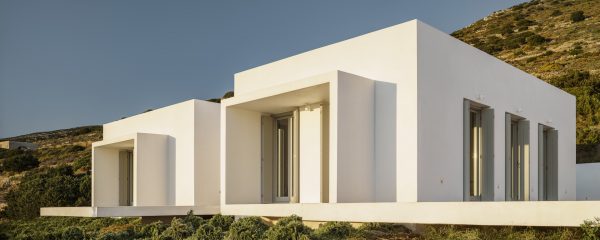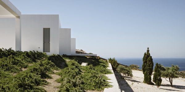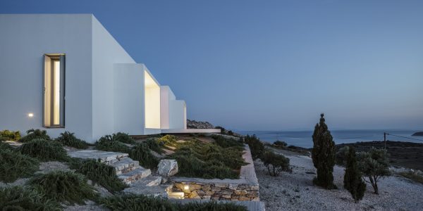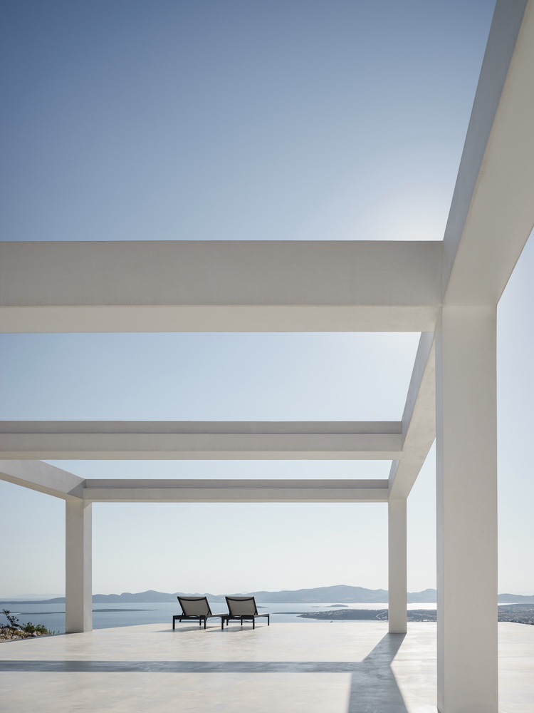 Χρησιμοποιώντας τα στοιχεία της κυκλαδικής αρχιτεκτονικής ανάλογων κτισμάτων , σχεδιάσαμε ένα σύνολο λευκών όγκων και εξωτερικών διαμορφώσεων , σε παράταξη, που εποπτεύει τη πλαγιά του λόφου μέχρι τη θάλασσα και τη γειτονική Αντίπαρο.Η κατοικία εναρμονίζεται με το τοπίο καθώς δεν δημιουργούνται καθόλου μπροστινές αυλές. Οι όγκοι τοποθετούνται κατά μήκος μιας υπάρχουσας πεζούλας- αναβαθμού χρησιμοποιώντας αποκλειστικά το φυσικό πλάτωμα.