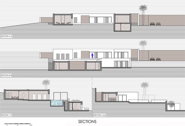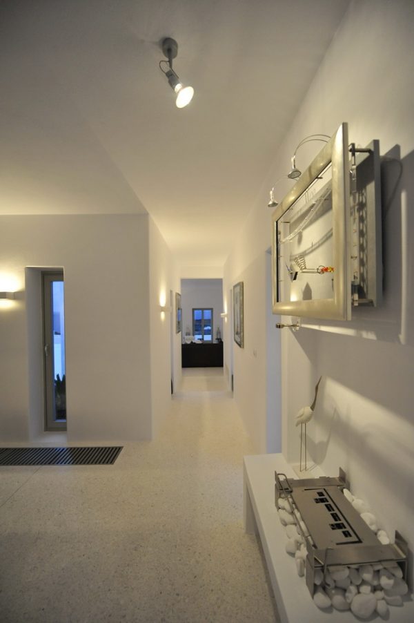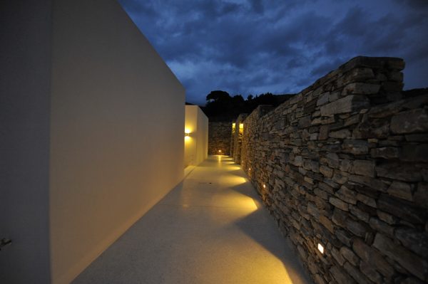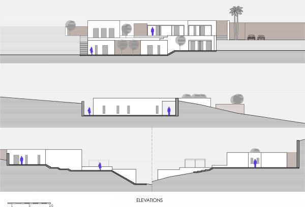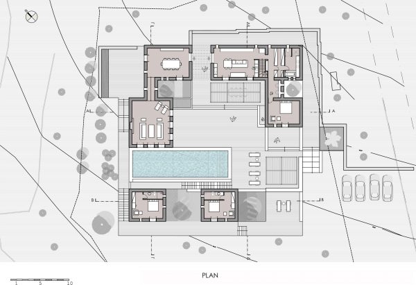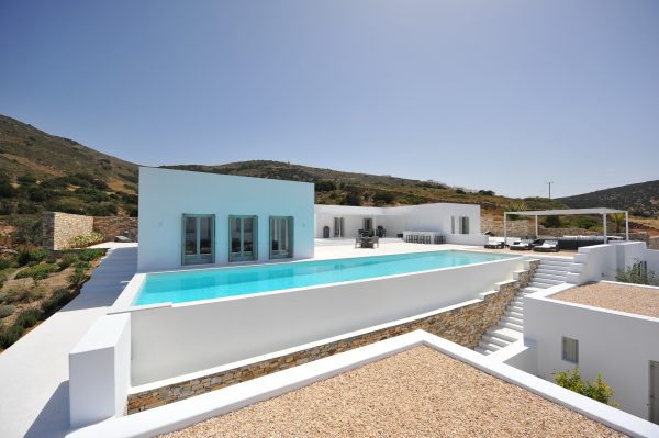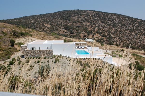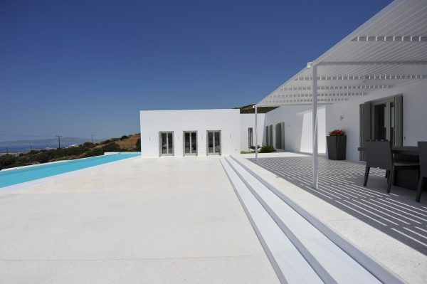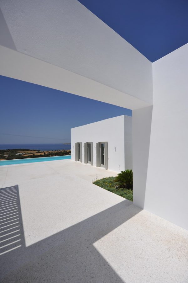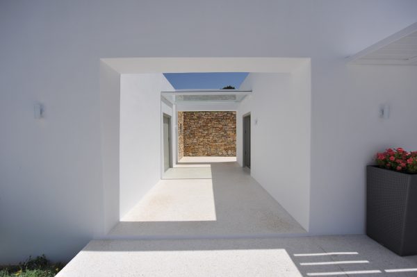 The plot is located at the island of Paros in the Cyclades. It has orientation in the big side South-western with view to the sea. The project concerns a summer house with hostels and a pool. The place of the residence is to benefit of the view to the Aegean Sea. The houses volumes are placed on a Π shaped layout with a central courtyard as according to traditional prototypes. The central courtyard organises the operations, creating a central core in direct report to the uses around it. Using the elements of the Cycladic Architecture, we designed a building that is adjusted to the landscape, split in different levels. In this way the adaptation of the building to the landscape is harmonious and the volume of the central residence is the least possible. The building from the eastern side is almost entirely adjusted to the ground. The architecture is subjugated in the landscape and at the same time is using the intense Cycladic light to elect a particular morphology using as background the arid landscape and the endless blue.