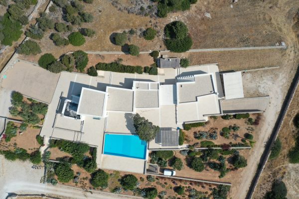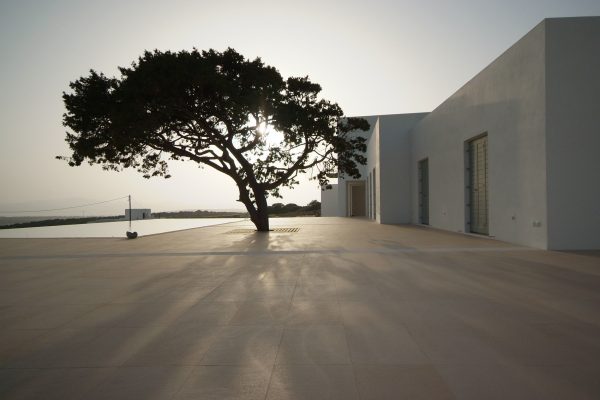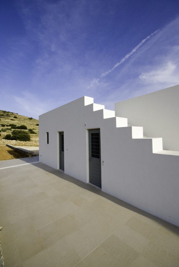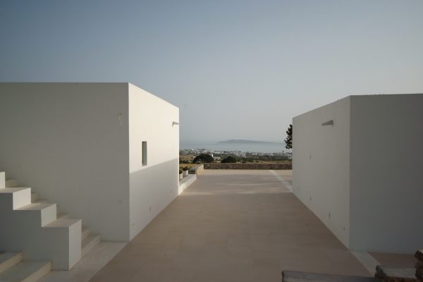 The alignment of the walls that compose the two buildings is radial so that there is a slight rotation of one volume from the other, like snapshots through a camera lens. Between the two buildings is created a through courtyard that frames the view to Antiparos.