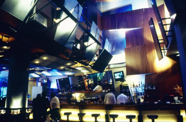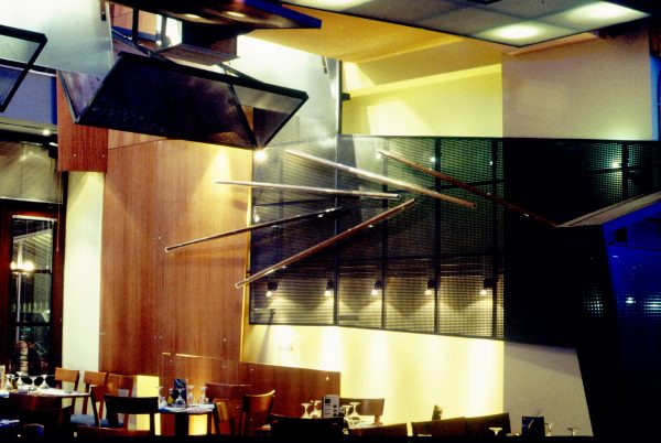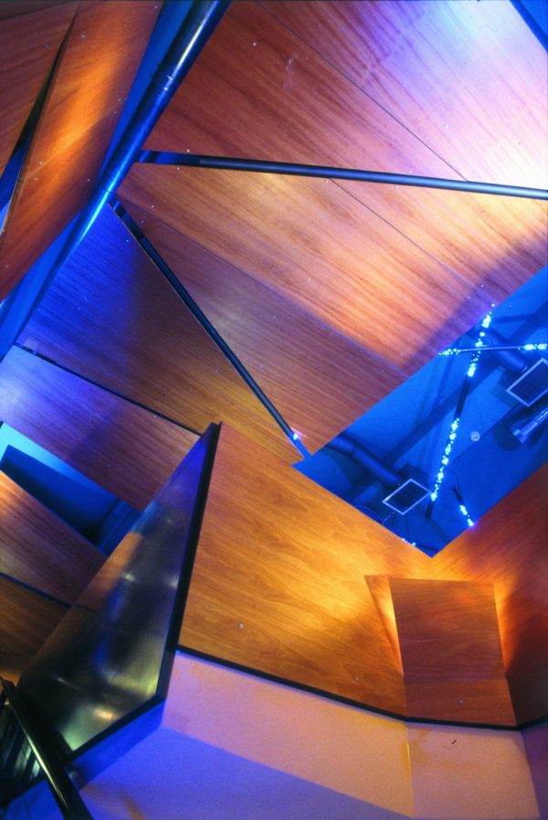 The geometry of the wooden panels in free trapezoidal shapes that float in the space as if their parts have collapsed.