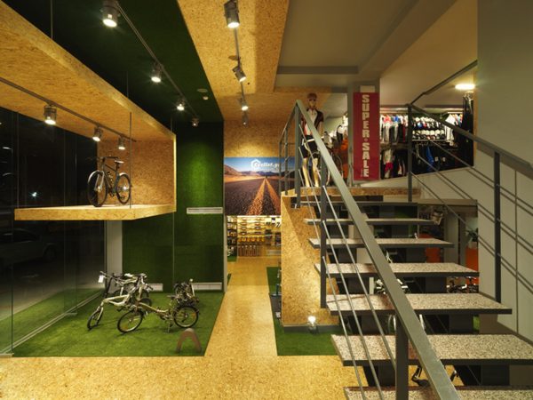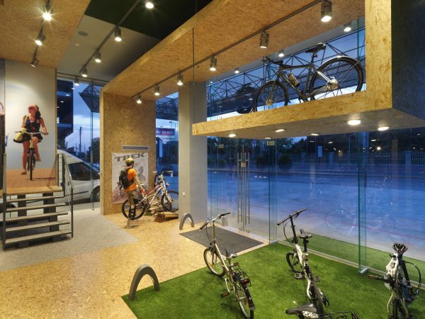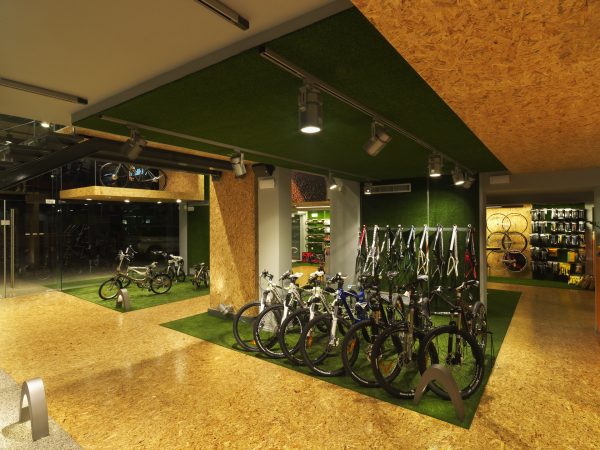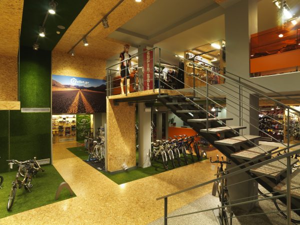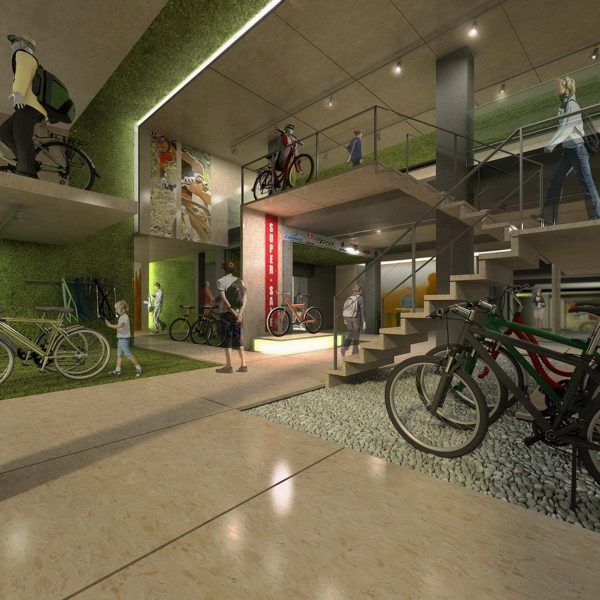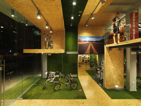 In the vertical surfaces bicycle parts are displayed. In the same level we have placed the bicycle repair shop as well as the space of the bicycle community (forum). The mezzanine serves the clothing and footwear department.