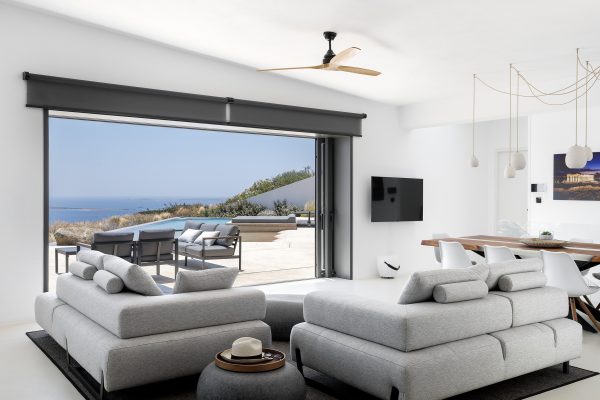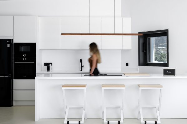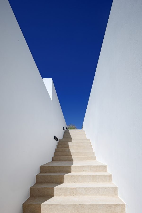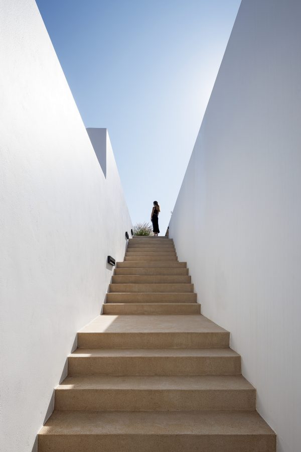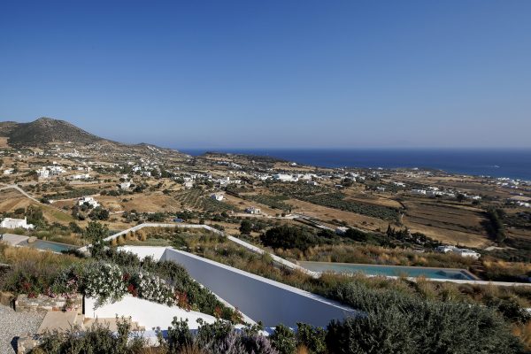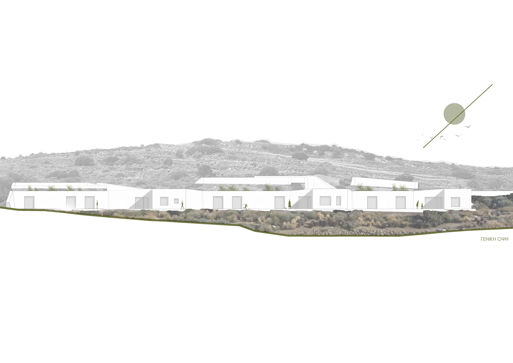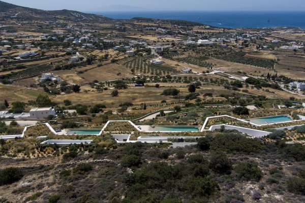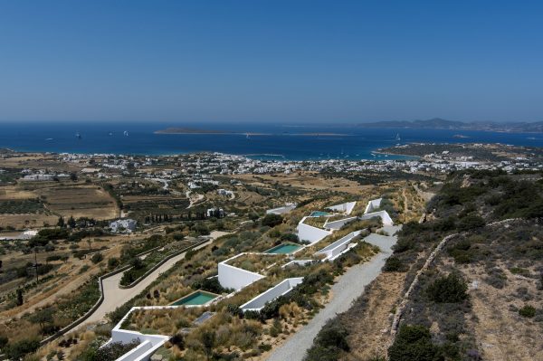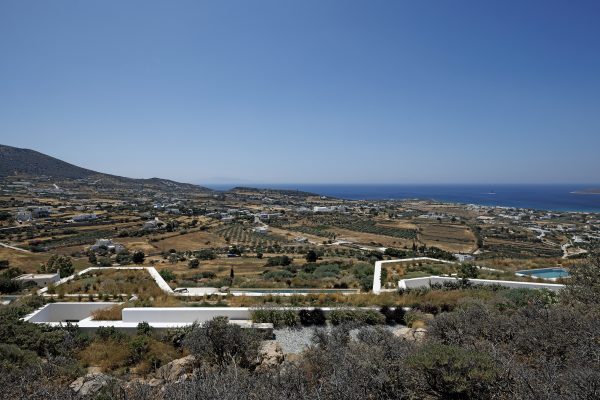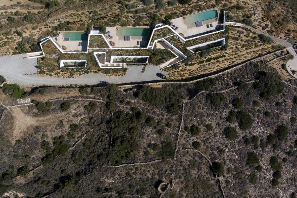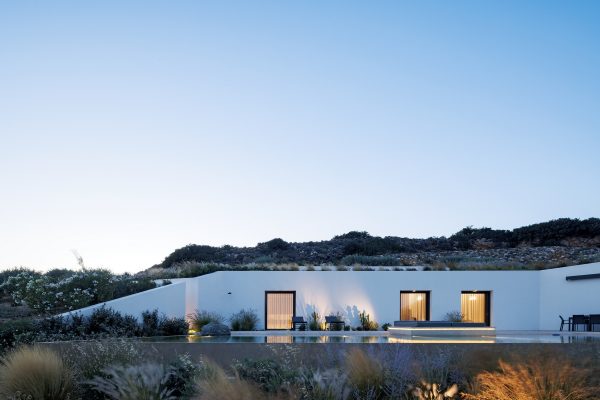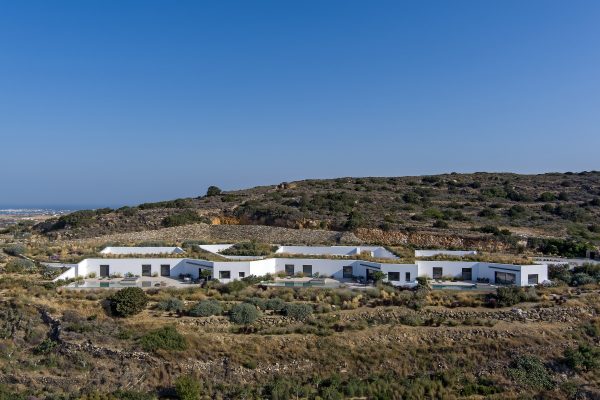 On the southern side of Paros, oriented southwest, three residences are conceived as a unified architectural gesture. Instead of repeating standardized volumes, the design adopts a free geometry: a white ribbon that rises from the ground, unfolds organically across the terrain, and embraces the natural morphology.