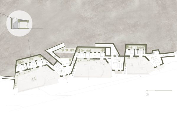 The proposal follows a dynamic, multifaceted layout that adapts to the topography and enhances spatial experience. The ribbon does not impose itself on the land but flows with plasticity and freedom, creating folds, courtyards, and terraces that align with the site’s natural rhythm.