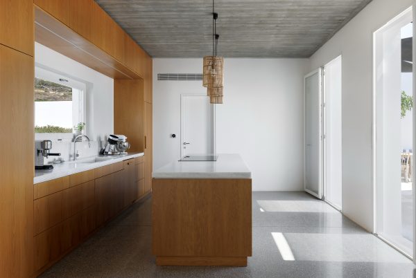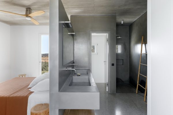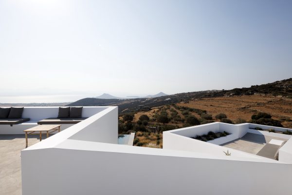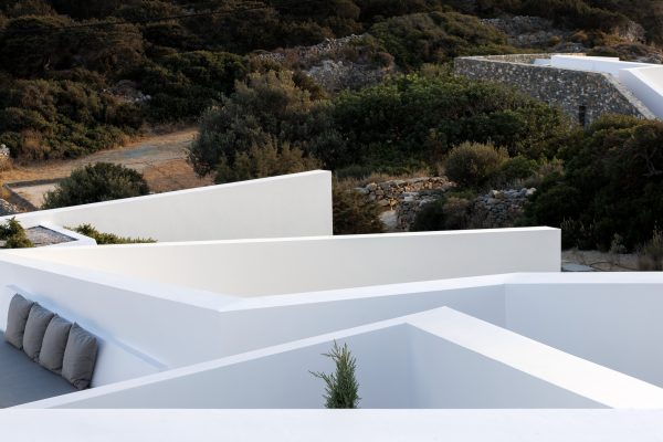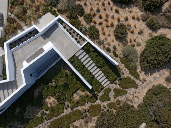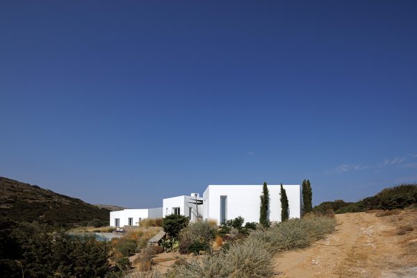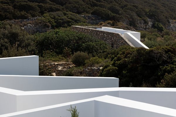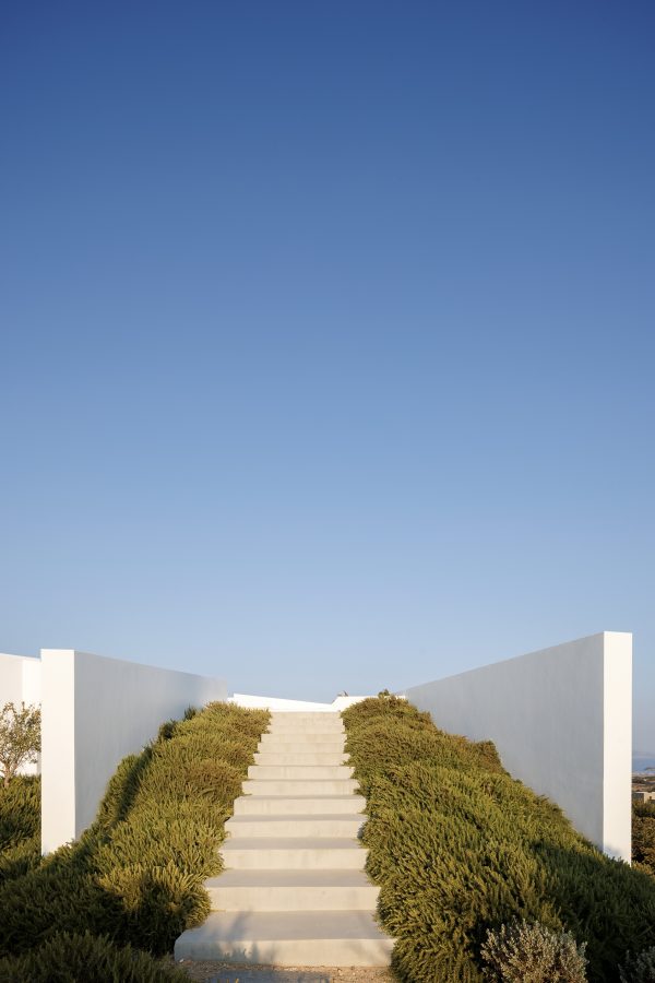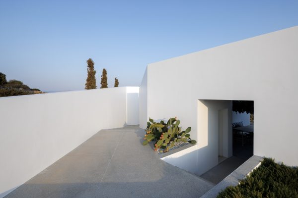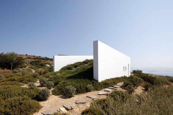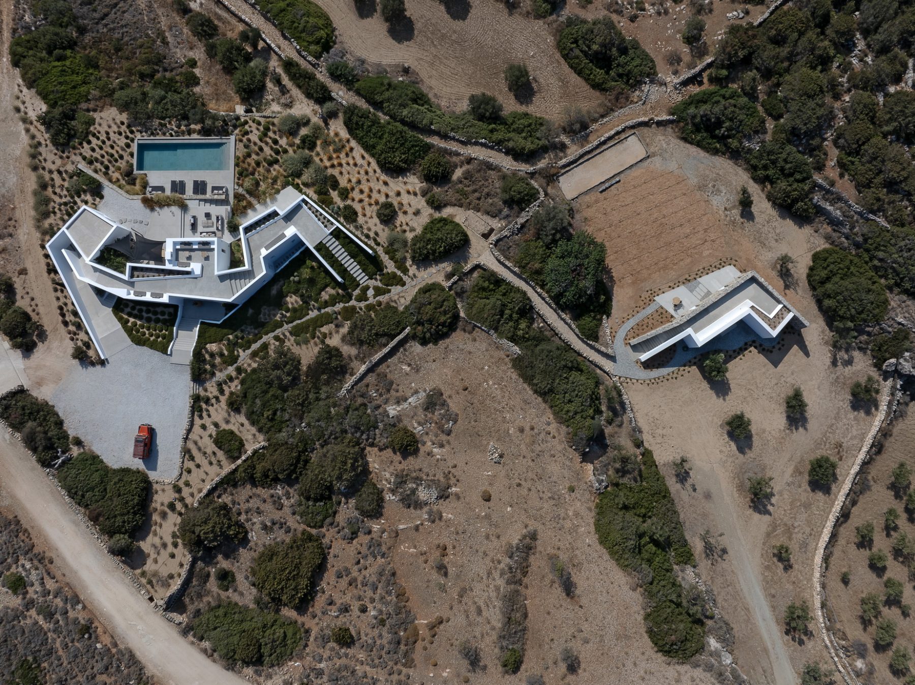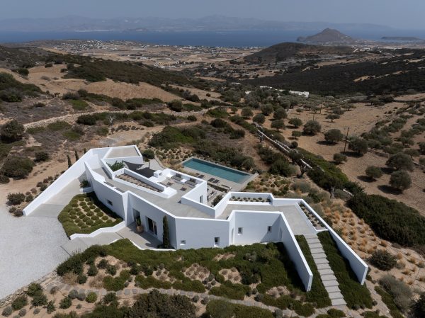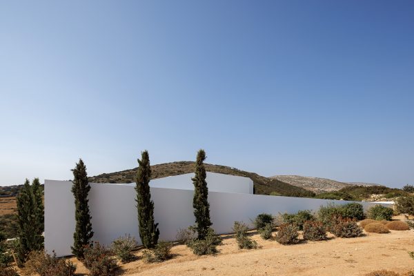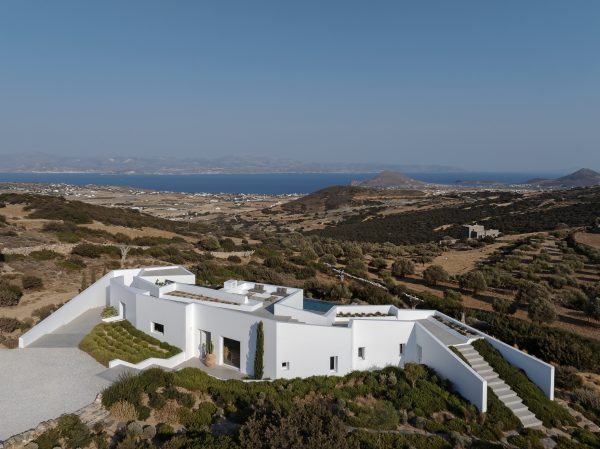 Embedded in the Cycladic hills, the house is conceived as an earthwork—an architectural form that feels inherently rooted in the terrain, as if sculpted from the land itself.
