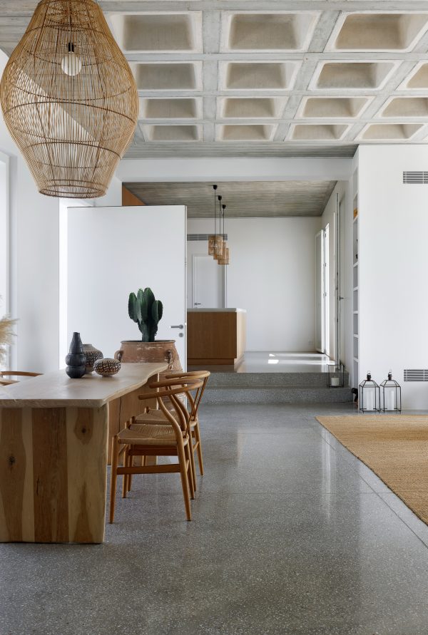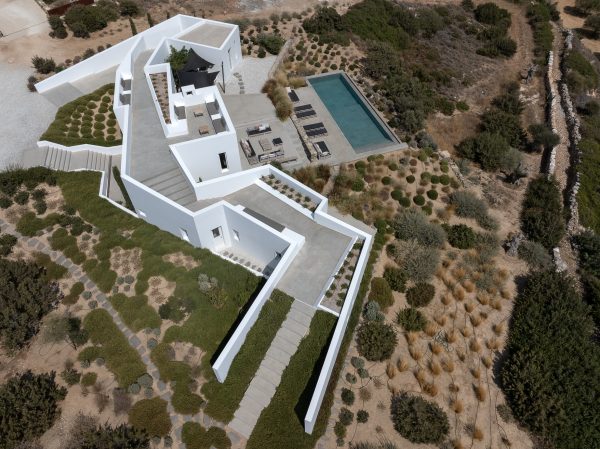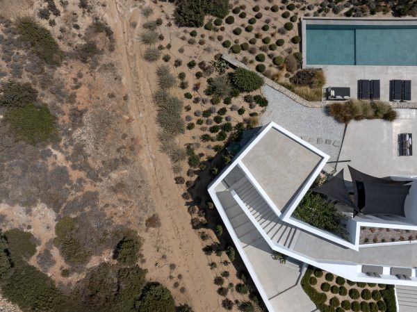 Nestled within the land’s contours, the house blends seamlessly with the surrounding olive grove. Its jagged outline echoes the rugged terrain, forming an organic structure that feels like a natural extension of the earth. The architecture appears to emerge from the landscape, as though shaped by time and nature itself.