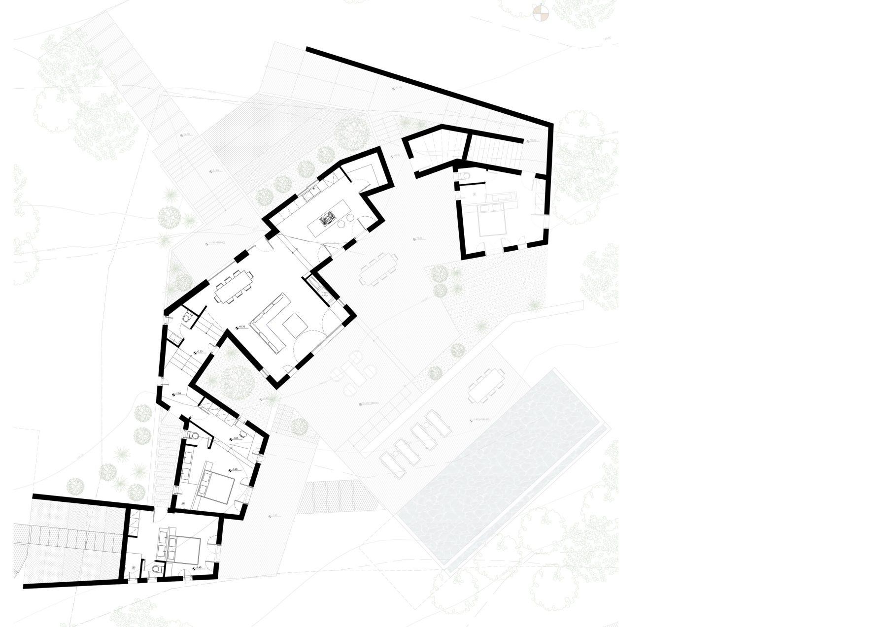 A fundamental aspect of the design is the fluid connection between the built and natural elements. The landscape extends onto the rooftops and into the adjacent lot, where the guest house is located. This continuity fosters a dialogue between the mountain path and the living spaces, reinforcing a sense of harmony between nature and architecture.