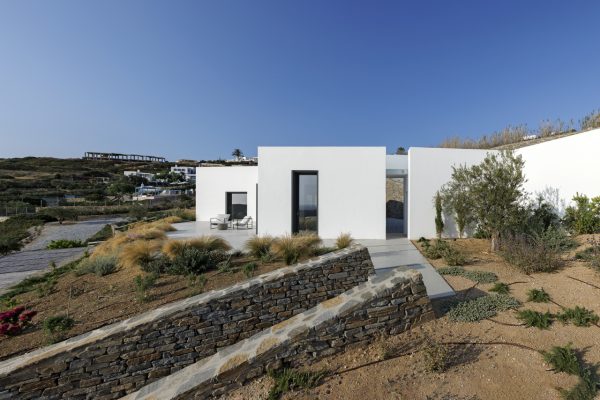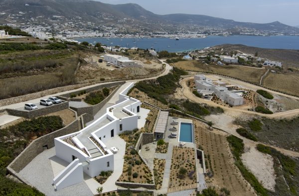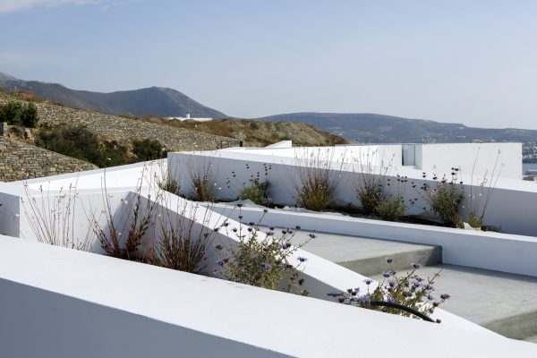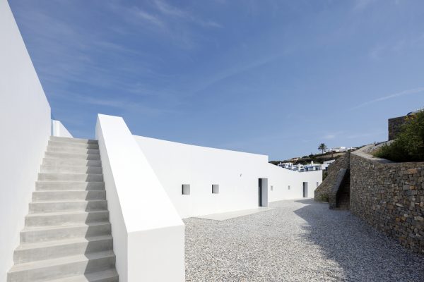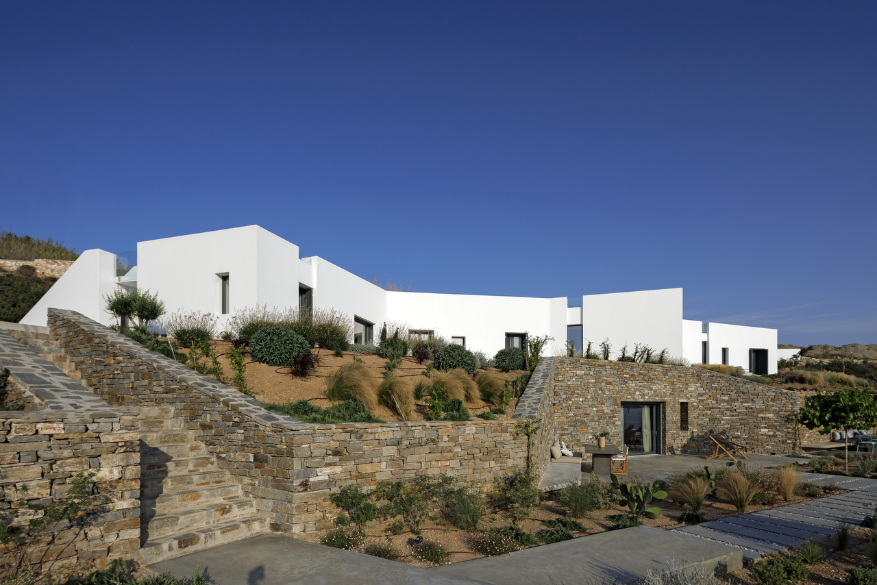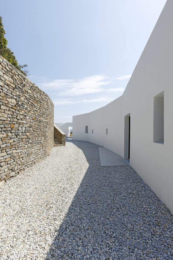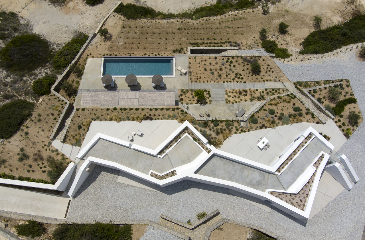 The orientation is southwest on the long side, overlooking the sea and the bay of Parikia. The project has its roots in the arid topography of the Cyclades and its white walls emerge from it, unfolding like a ribbon in the landscape forming the volumes of the house and the external and internal living spaces. The surfaces with small deviations give the possibility to exploit the view and create privacy between the two houses.