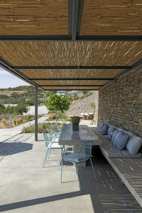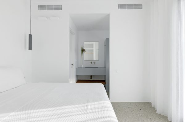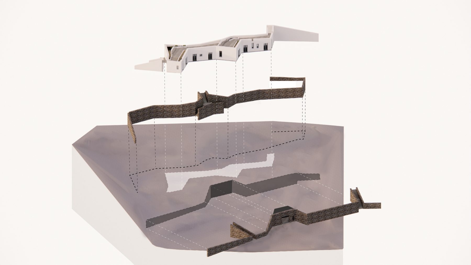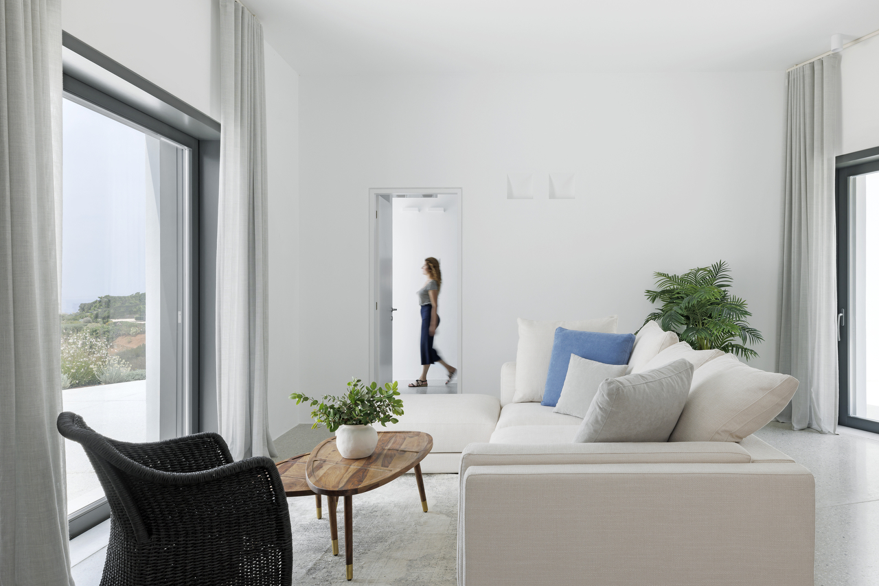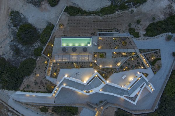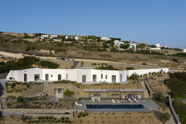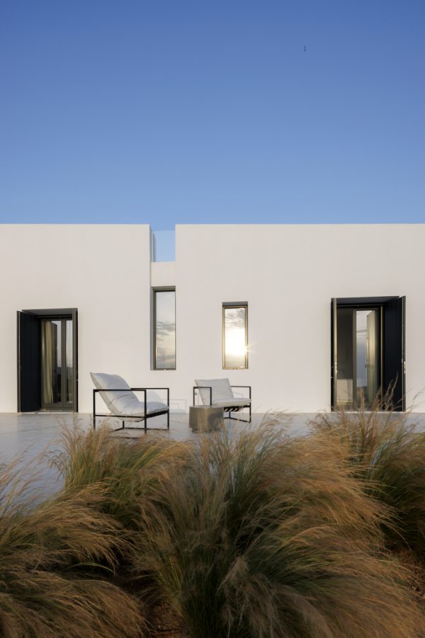 The orientation is southwest on the long side, overlooking the sea and the bay of Parikia. The project has its roots in the arid topography of the Cyclades and its white walls emerge from it, unfolding like a ribbon in the landscape forming the volumes of the house and the external and internal living spaces. The surfaces with small deviations give the possibility to exploit the view and create privacy between the two houses.