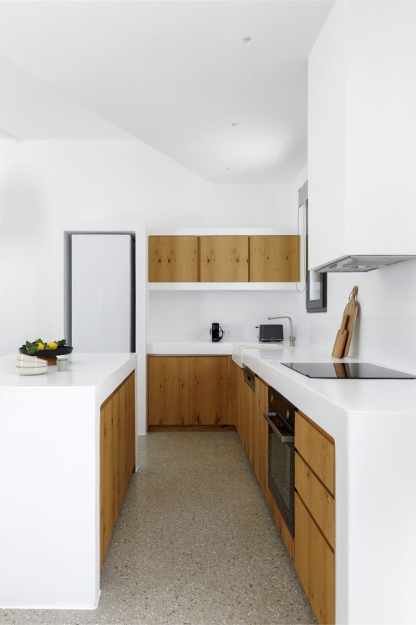 The logic of the ribbon can also be seen in the flexible flows that arise both between the living spaces and the roof. The visitor entering from the central staircase, the highest point of the plot and the road, is led between the white and the stone retaining wall reminiscent of dry stone. From there he can either enter the building or continue his course towards the planted roof and sitting areas and enjoy the view of the bay. The building, although inspired by the materials and layout of local architecture, aims to redefine it through a modern prism. The dipole between white surfaces and stone that enclose the residence highlights a form with plasticity.