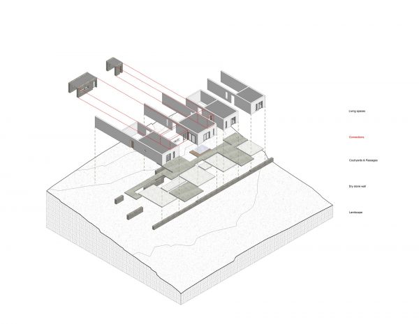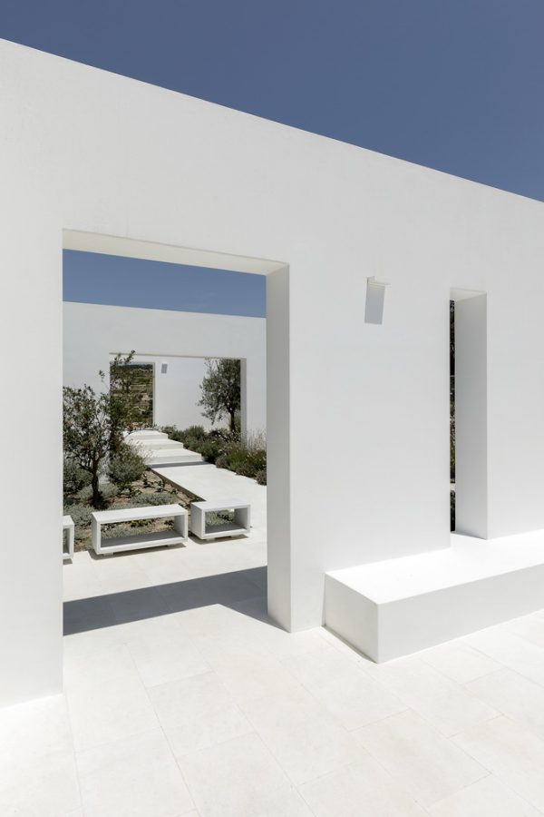 The architecture swings over The landscape forming spatial units in the attempt to define the scenario of the holiday habitability. The intense Cycladic light elaborately stages all possible scenarios and transforms, during the day, the architectural composition. Architecture embraces human activity, creating an intimacy with space and place.