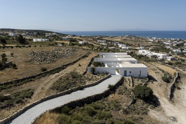 The plot is located in the southern part of Paros Island. It has a southwest orientation on the long side, overlooking the sea, the bay of Aliki and Antiparos. The building rests on the hillside and adapts to the topography and the terrain’s morphology.
