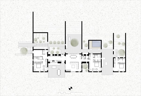 The large volume of a single building is broken down into smaller volumes, directly adapted to the terrain. The “Fifth view”, from above, becomes dominant leaning against the hillside.