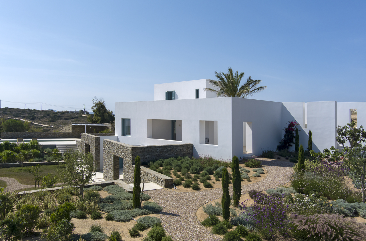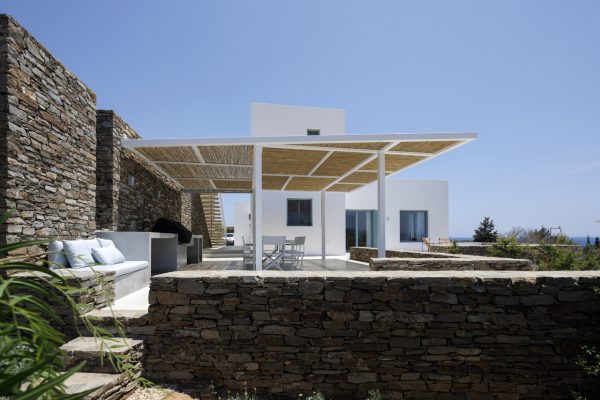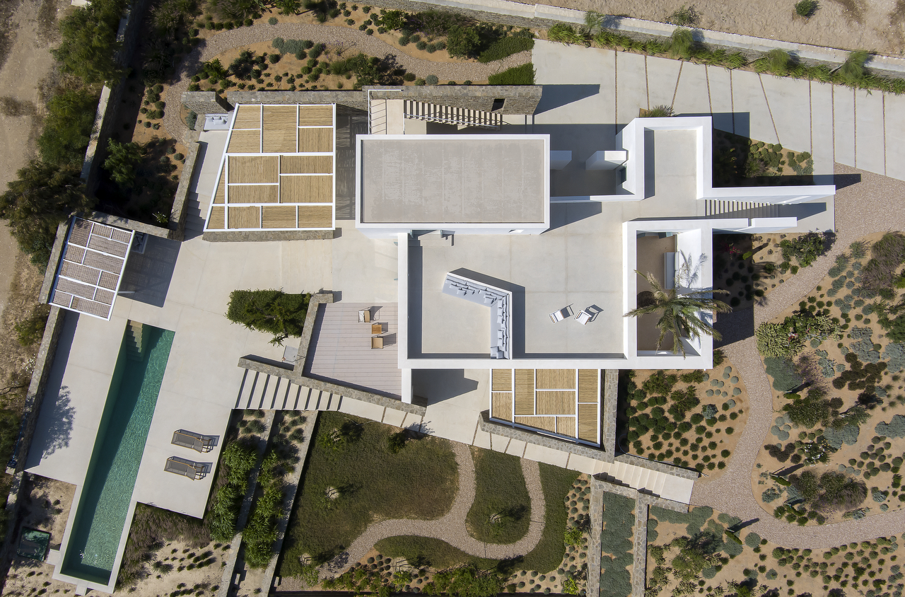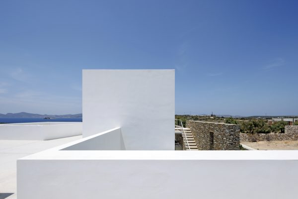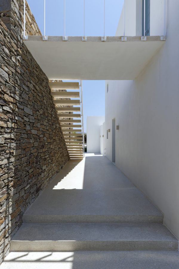 The building’s design unfolds along parallel and perpendicular axes, forming the characteristic cubic volumes of Cycladic residential complexes. To accentuate this geometric arrangement, three additional parallel walls were incorporated. Two white walls extend towards the entrance, enclosing the staircase leading to the rooftop living room, while a third stone wall on the north facade houses the staircase to the first-floor room.