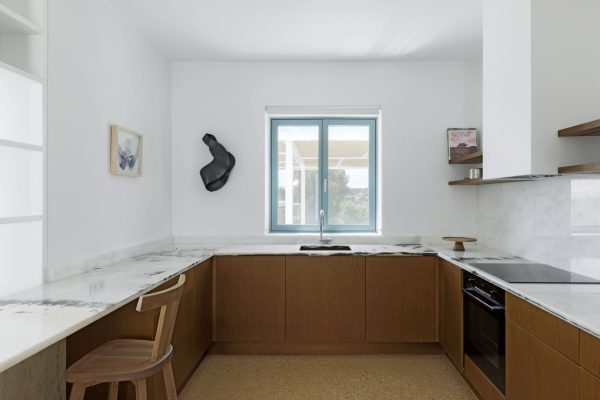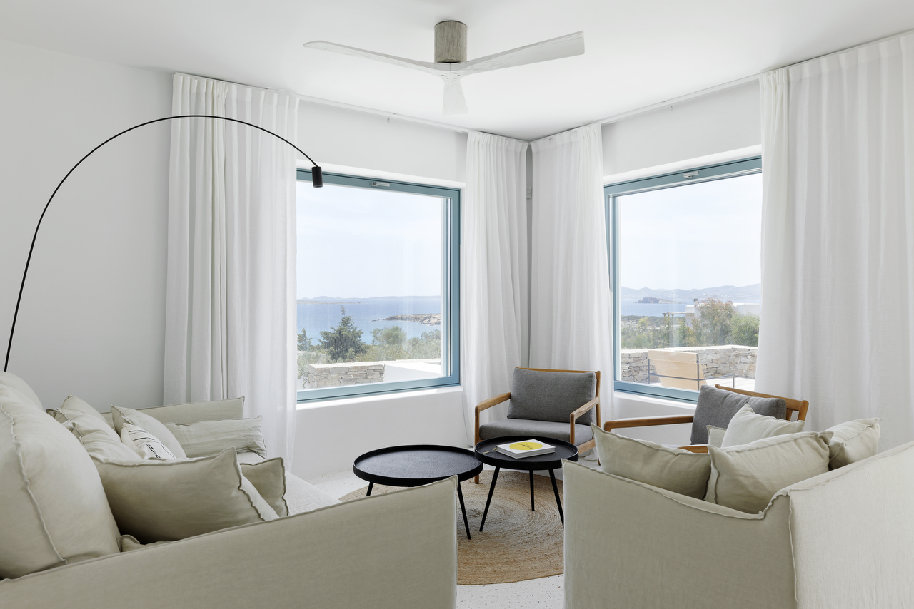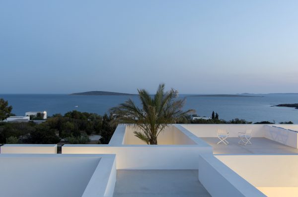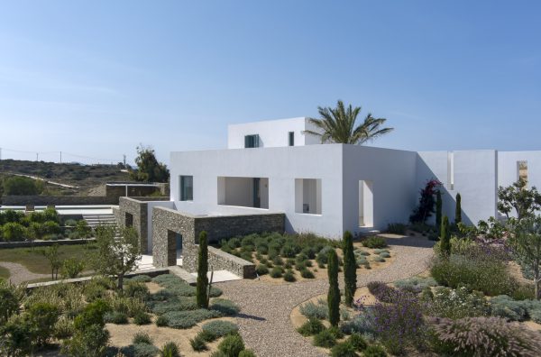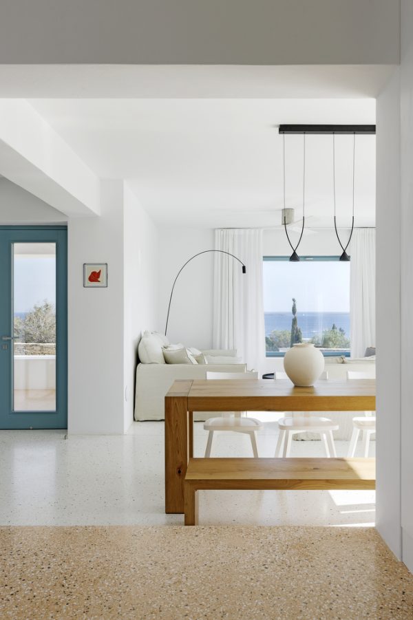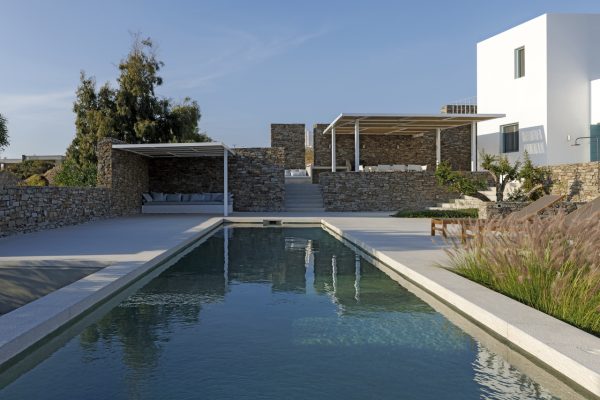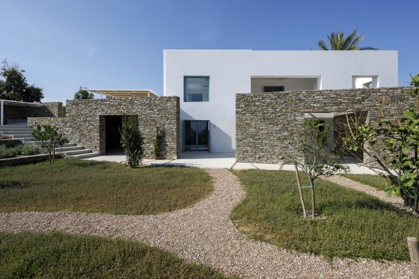 A notable feature is the palm tree in the enclosed courtyard, adding to the nostalgic ambiance of the Cycladic landscape. The building’s ambiance is further enhanced by the combination of small openings, stone walls accommodating pergolas and decks, fragrances from plants, and meticulous garden landscaping, reminiscent of Monet’s paintings.