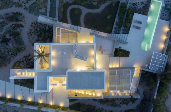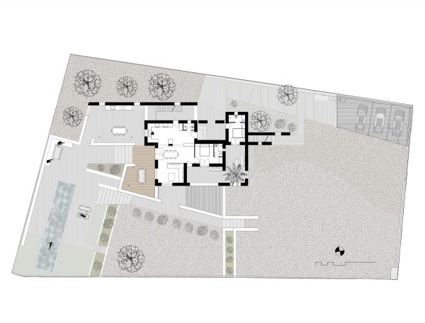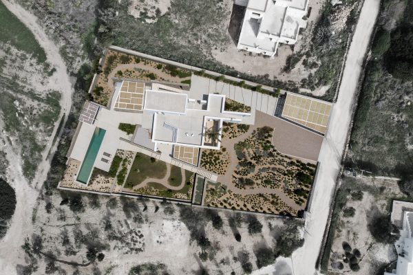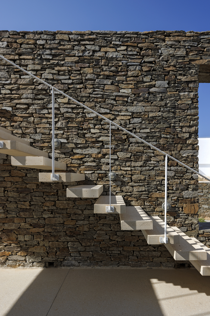 Attention to construction details is evident, with specially designed metal pergolas filled with local reed and a minimalist railing that securely attaches to the staircase’s steps. The building’s base is adorned with visible stonework to minimize its volume, while the stone walls extend into the relief, creating leisure spaces, external courtyards, and paths that seamlessly blend interior and exterior environments.