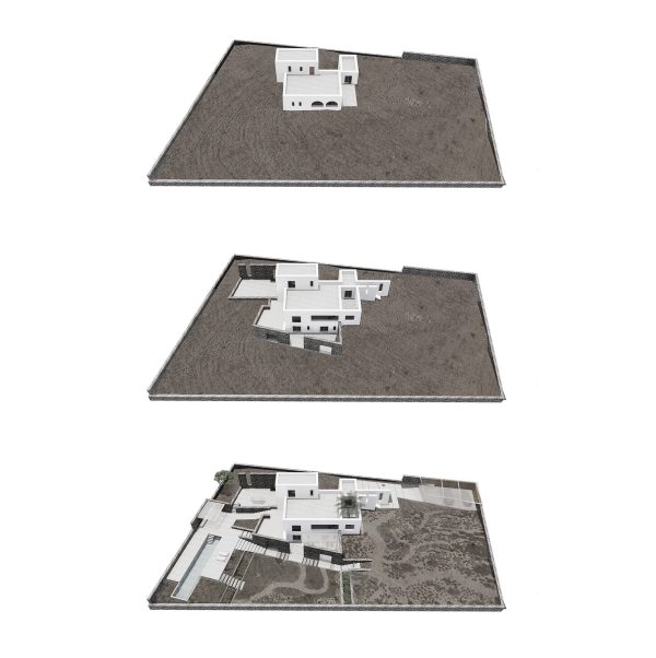 Rotating the imaginary axis of the building by 15° was crucial to perfectly frame the view of Makria Myti bay. This adjustment facilitated the creation of all exterior spaces and configurations. The primary objective was to minimally intervene, transforming the building from a cluster of volumes into a residence that seamlessly integrates with the landscape’s morphology and spatial elements.